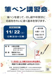 11月9日(日) 9時30分から料金を添えて直接大麻公民館窓口へ申し込みください。 |